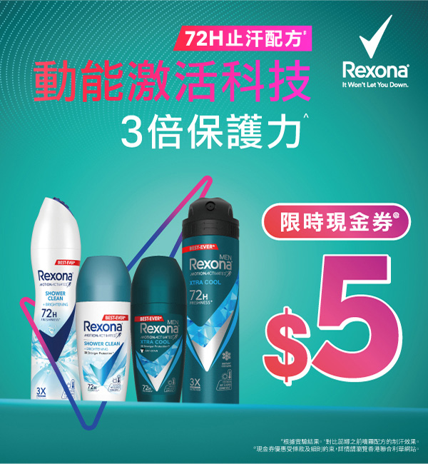 購買任何Rexona 止汗香體產品,可於指定時間內作HK$5使用。