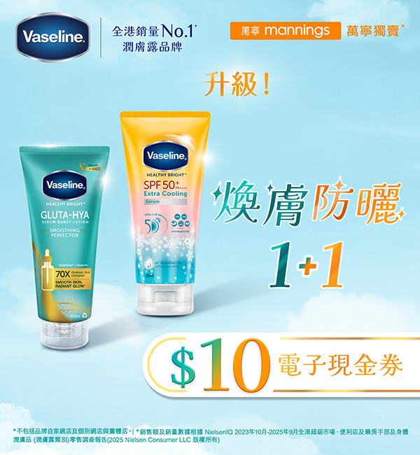 此優惠券只適用於有效期內凡購買任何一支Vaseline 凡士林®Gluta-Hya 身體精華凝乳系列或SPF50 日常防曬身體精華液系列,可於指定時間內作HK$10使用。